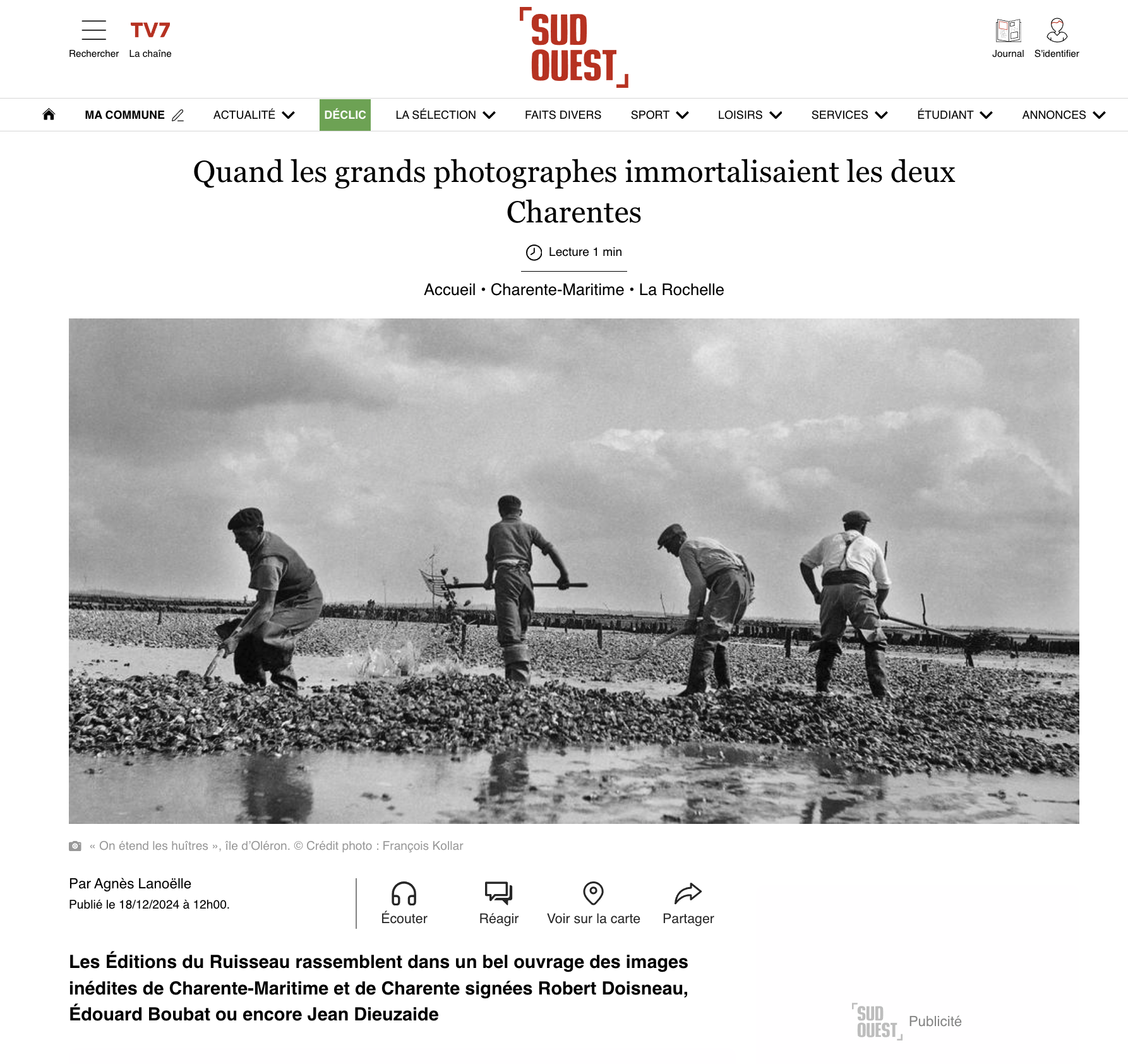 Le port et le marché aux poissons de La Rochelle, l’élégante plage de Royan avant le bombardement de 1945, la petite famille Doisneau sur l’île de Ré, les travaux des ostréiculteurs de Marennes ou Brouage, les quais de la Charente à Saintes ou encore la méticuleuse préparation du divin élixir dans le clair-obscur des caves de Cognac… Tant d’instantanés de vie partagés par ces orfèvres de la belle image ou, plutôt, de l’image vraie.